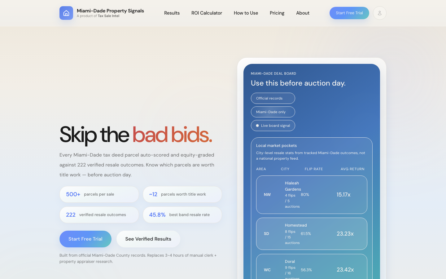 Tax sale intelligence does not travel cleanly from one market to another. Each county has its own records, timelines, auction mechanics, property mix, and investor heuristics. The organization needed to grow beyond a single market without shipping the same generic dashboard everywhere or rebuilding the product from scratch every time a new county came online.